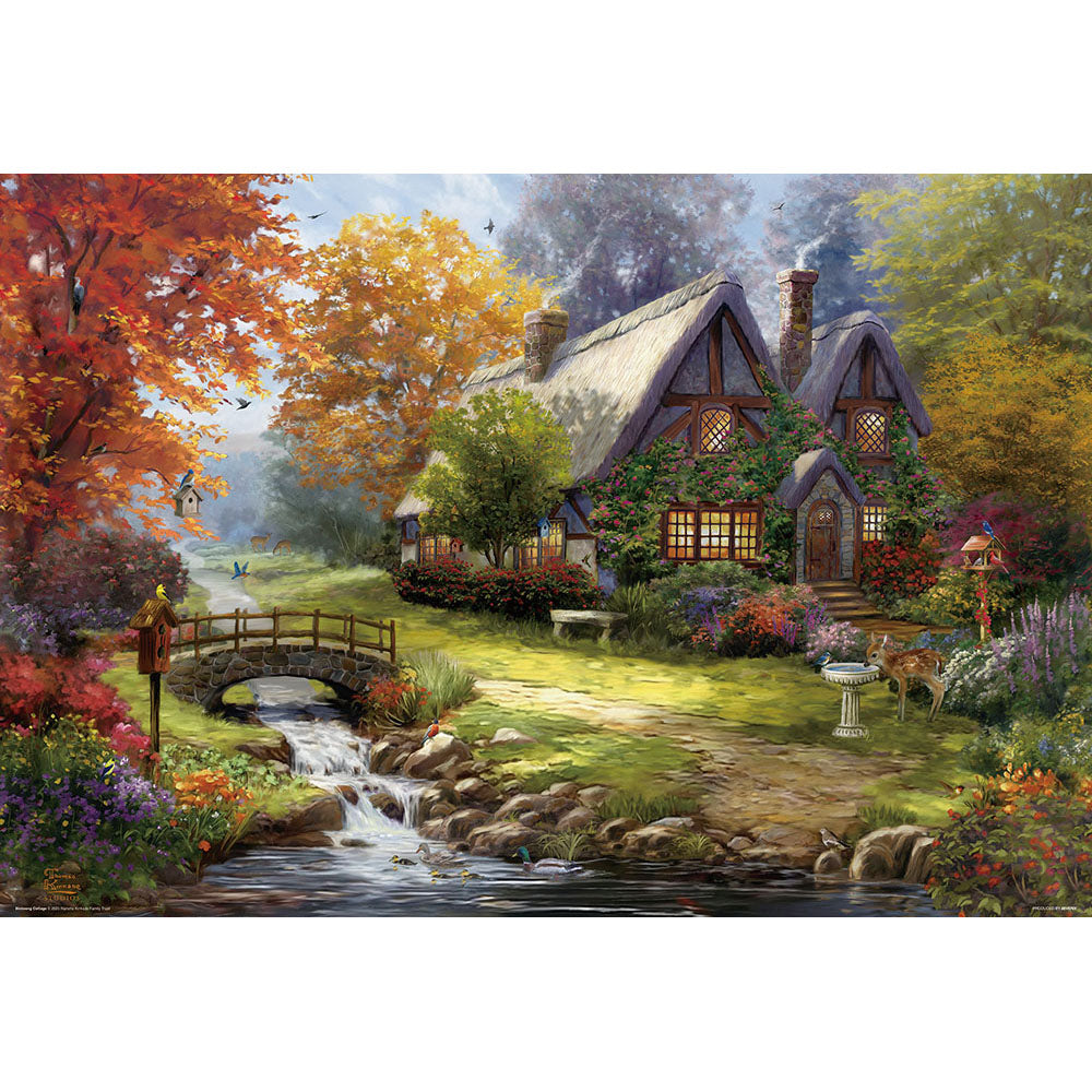 秋の庭にたたずむ茅葺のコテージ。小鳥のさえずりや小川のせせらぎ、木漏れ日に揺れる木々の光が、穏やかな時間とぬくもり感じさせる温かな作品です。