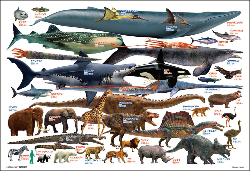 ティラノサウルスなどの古生物から現存するシロナガスクジラなど大迫力の巨大生物の大きさをくらべて学べる!