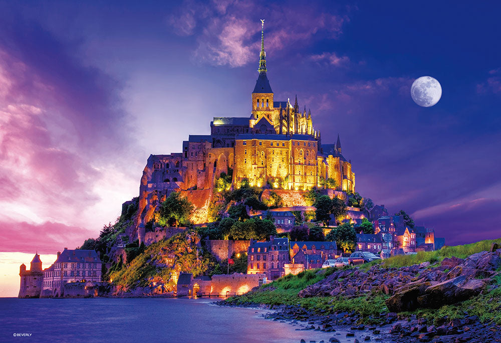 海に浮かぶ修道院モン・サン・ミシェルが暮れ行く空に映える。(フランス)